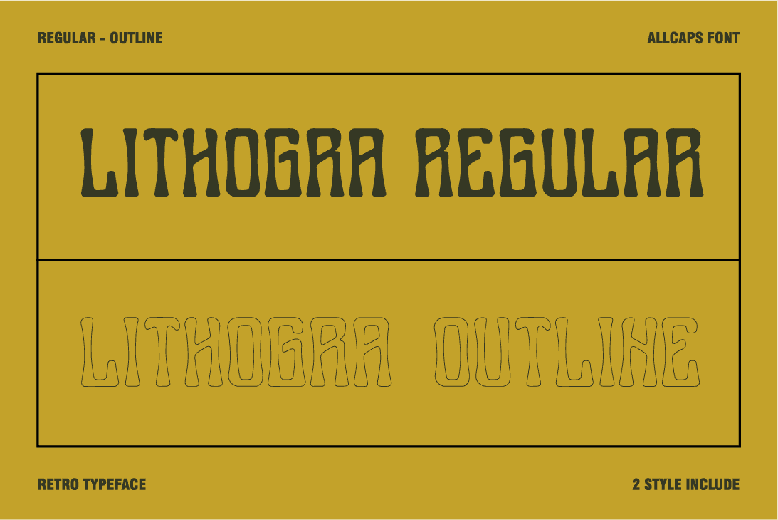 Lithogra is a retro vintage font that channels the essence of classic design with a nostalgic twist. Its bold, geometric shapes and elegant curves reflect the timeless beauty of mid-century typography, while its unique character brings a fresh, vintage vibe to modern projects. Perfect for branding, packaging, and headlines, Lithogra captures the spirit of a bygone era while offering versatility and readability. Whether used for large display text or subtle details, Lithogra exudes a sense of style and sophistication, making it ideal for anyone looking to evoke a sense of the past in a contemporary setting.
