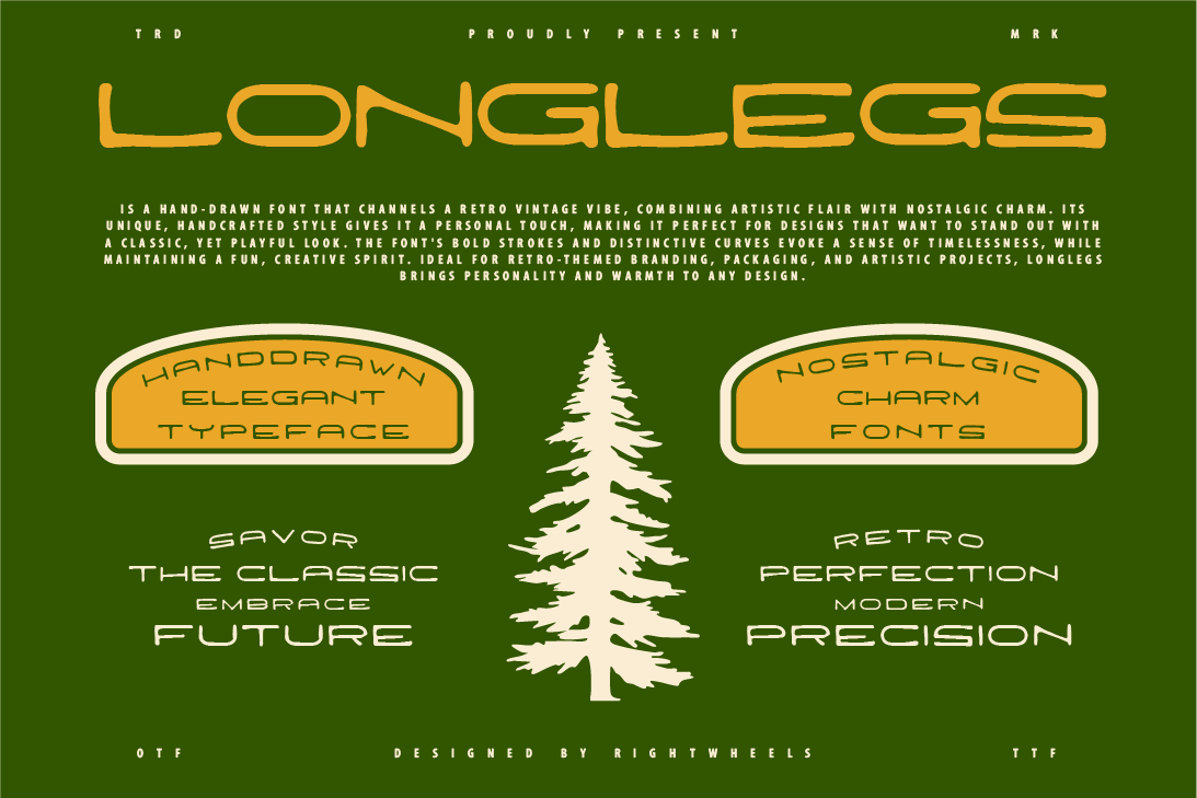 Longlegs is a hand-drawn font that channels a retro vintage vibe, combining artistic flair with nostalgic charm. its unique, handcrafted style gives it a personal touch, making it perfect for designs that want to stand out with a classic, yet playful look. the font’s bold strokes and distinctive curves evoke a sense of timelessness, while maintaining a fun, creative spirit. ideal for retro-themed branding, packaging, and artistic projects, longlegs brings personality and warmth to any design.