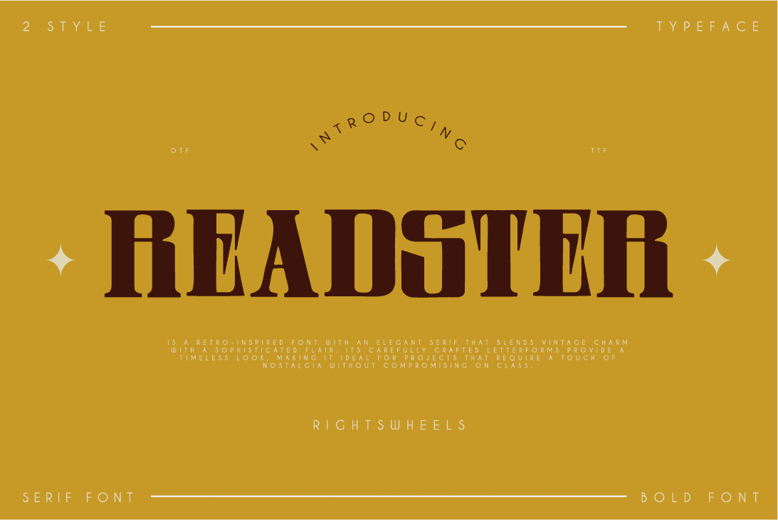 Readster is a retro-inspired font with an elegant serif that blends vintage charm with a sophisticated flair. Its carefully crafted letterforms provide a timeless look, making it ideal for projects that require a touch of nostalgia without compromising on class.