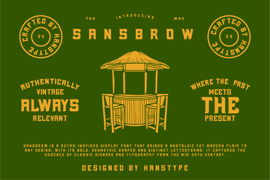 Sansbrow is a retro-inspired display font that brings a nostalgic yet modern flair to any design. With its bold, geometric shapes and distinct letterforms, it captures the essence of classic signage and typography from the mid-20th century.